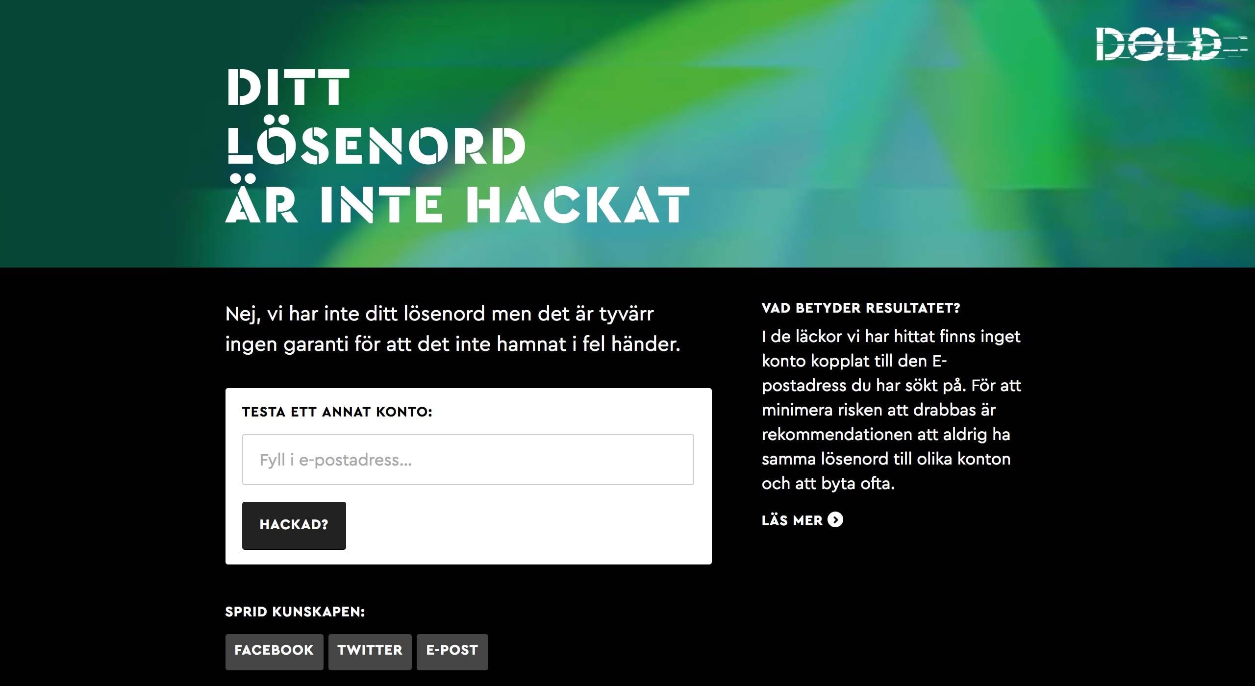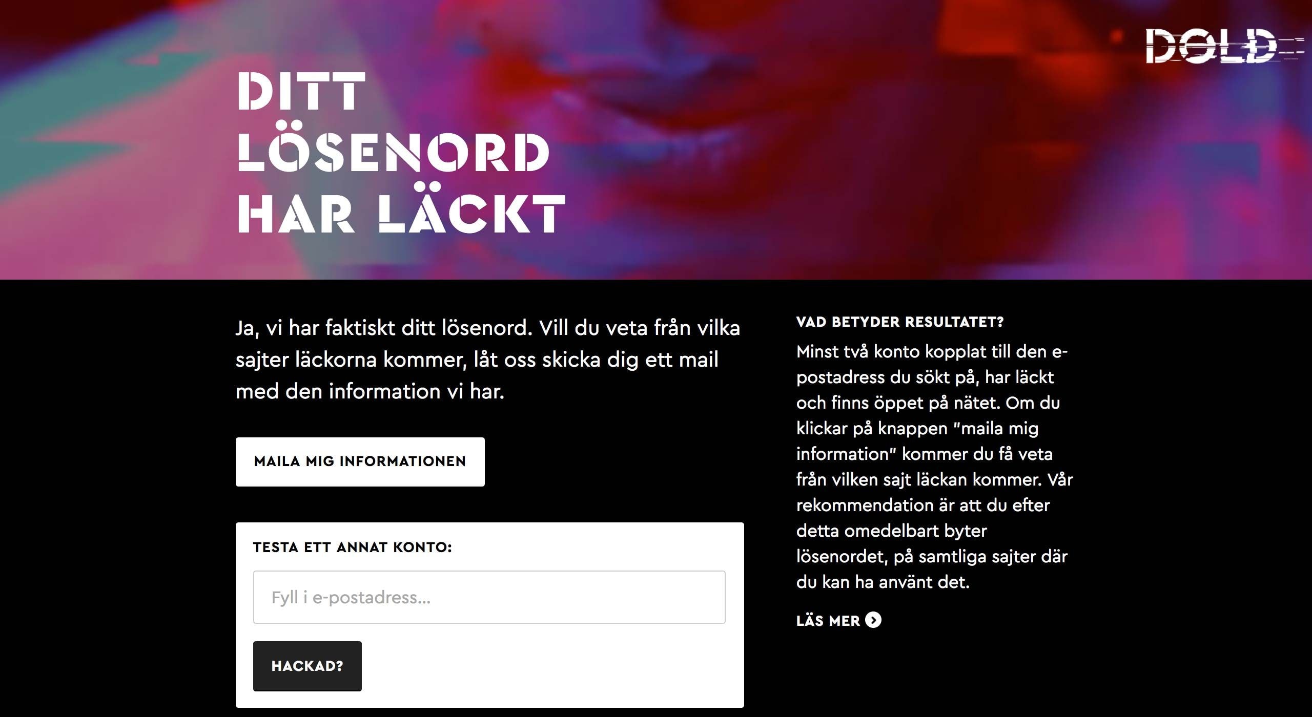 Har vi ditt lösenord? was a service to complement SVT Dold’s reportage on password security. Users could inquire whether their login details were part of the over 1 billion accounts that SVT compiled from data breaches. If the login details were found, the user could request an email with information about the hacked websites, and instructions on how to improve the user’s password security.