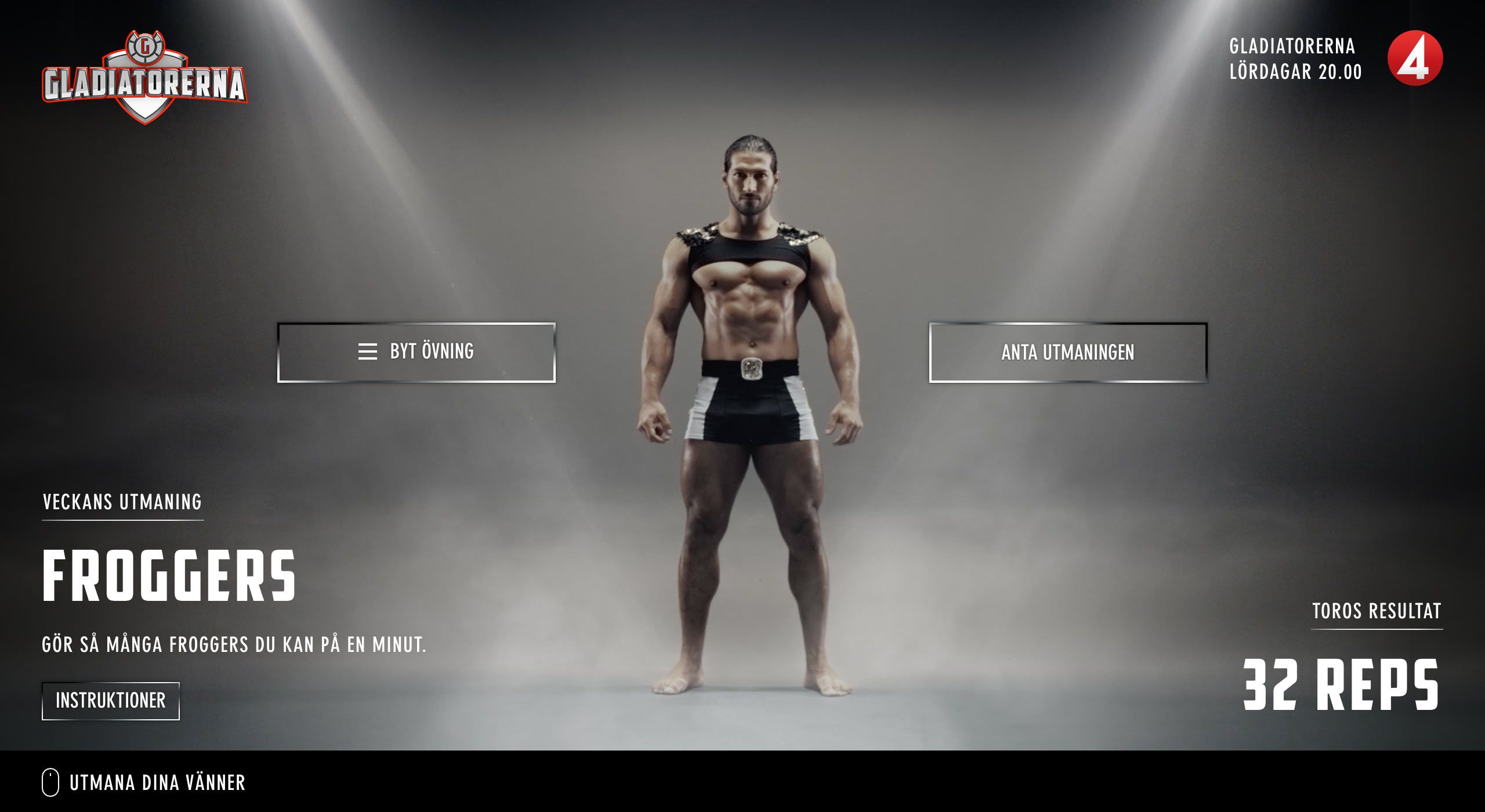 Utmanare Redo ("Contender Ready") was a campaign with the goal of attracting the fitness audience to the TV show Gladiatorerna ("The Gladiators"). We created a website where gladiators challenged the public in weekly fitness exercises. By accepting the challenge visitors could realize the level of fitness required of the gladiators, thus changing their opinion on them, from pure muscle mass to actual athletes.